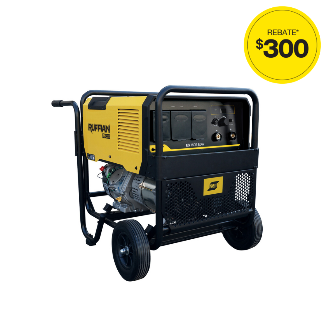 The Ruffian ES 150G engine driven welder is a lightweight, powerful, all-in-one DC Stick welding machine and AC generator combined.As a welder, Ruffian uses inverter technology to provide up to 150 A of reliable welding power at 60% duty cycle in a very stable arc that helps avoid rework.As a gas-powered AC generator, Ruffian uses a 14 HP Kohler® engine to deliver up to 4.5 kW starting power. Its 120 VAC and 240 VAC outlets provide versatility to run lights, grinders, hand tools –even light-duty plasma cutters and MIG/TIG welding power sources. It can even serve as an emergency power generator.