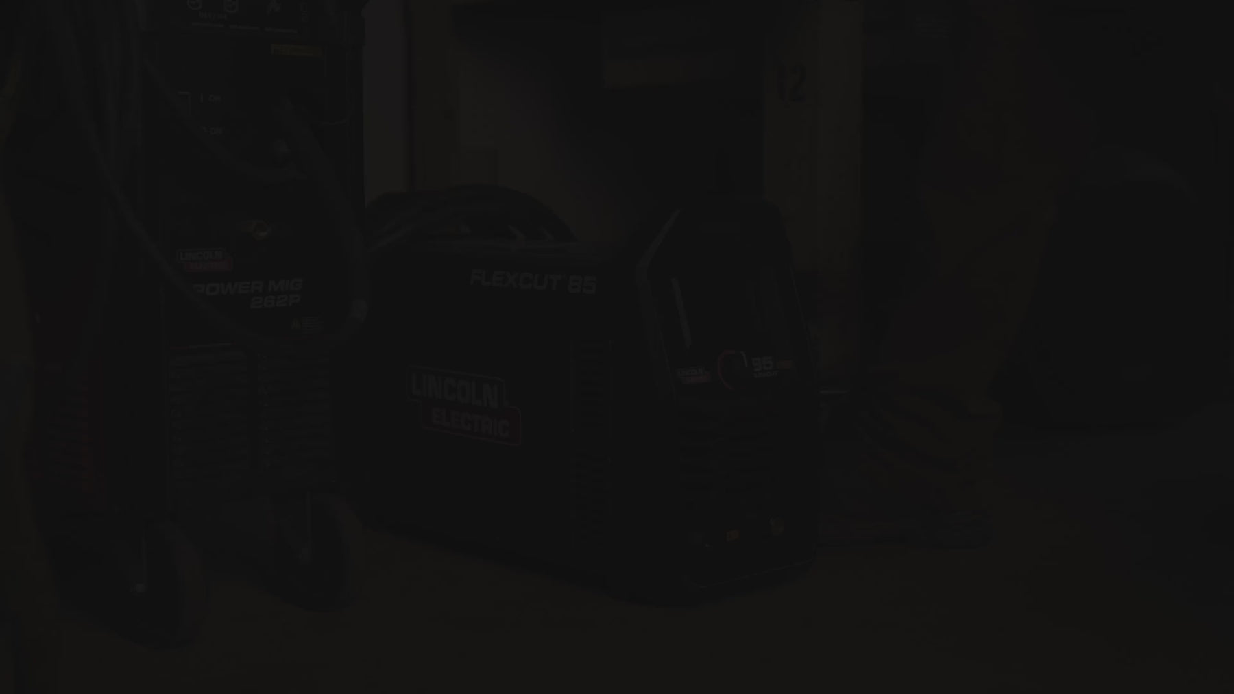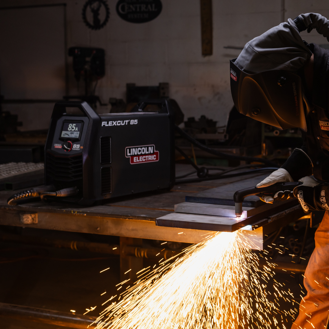 Person cutting metal with a Lincoln Electric FlexCut 85 plasma cutter in a workshop.